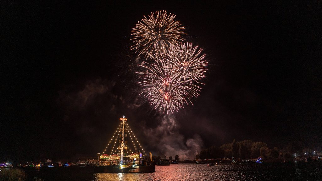 Fiesta fluvial tradicional con show en barcos, fuegos artificiales y comparsas acuáticas.